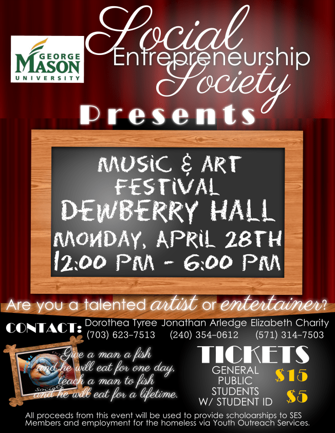 We are so excited about this upcoming event at Dewberry Hall on the George Mason University campus! Mark our calendars and come out and support us on Monday, April 28th from 12:00 p.m. until 6:00 p.m. Admission is $15 for the general public and $5 for students with a valid student ID. We invite you to download and share the flyer and contact any of the persons listed for more information, tickets or to discover how you may become a vendor or a featured act or artist.